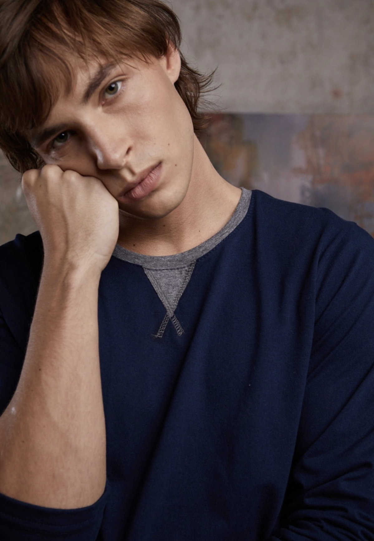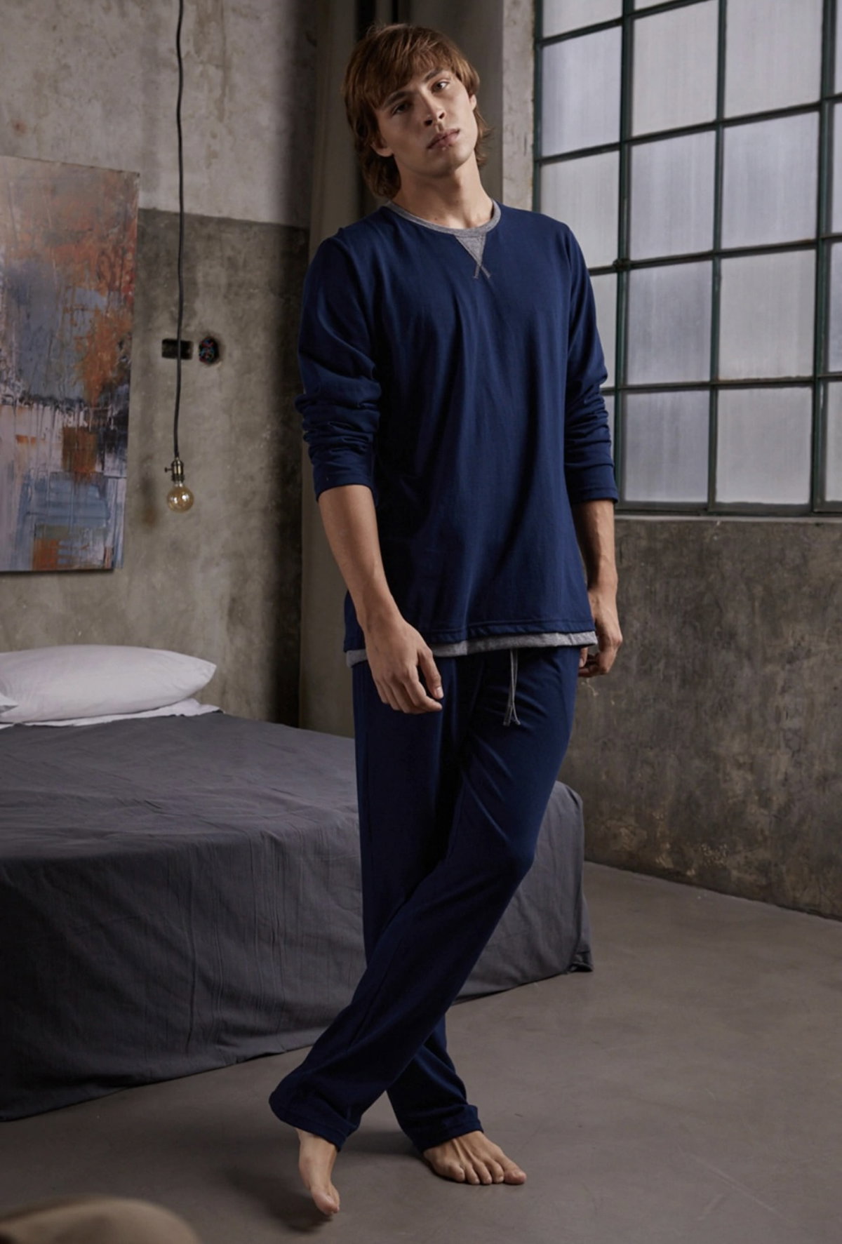 Modelo con remera manga larga y pantalon largo liso tipo recto con bolsillos, ambas prendas son de algodón suave.